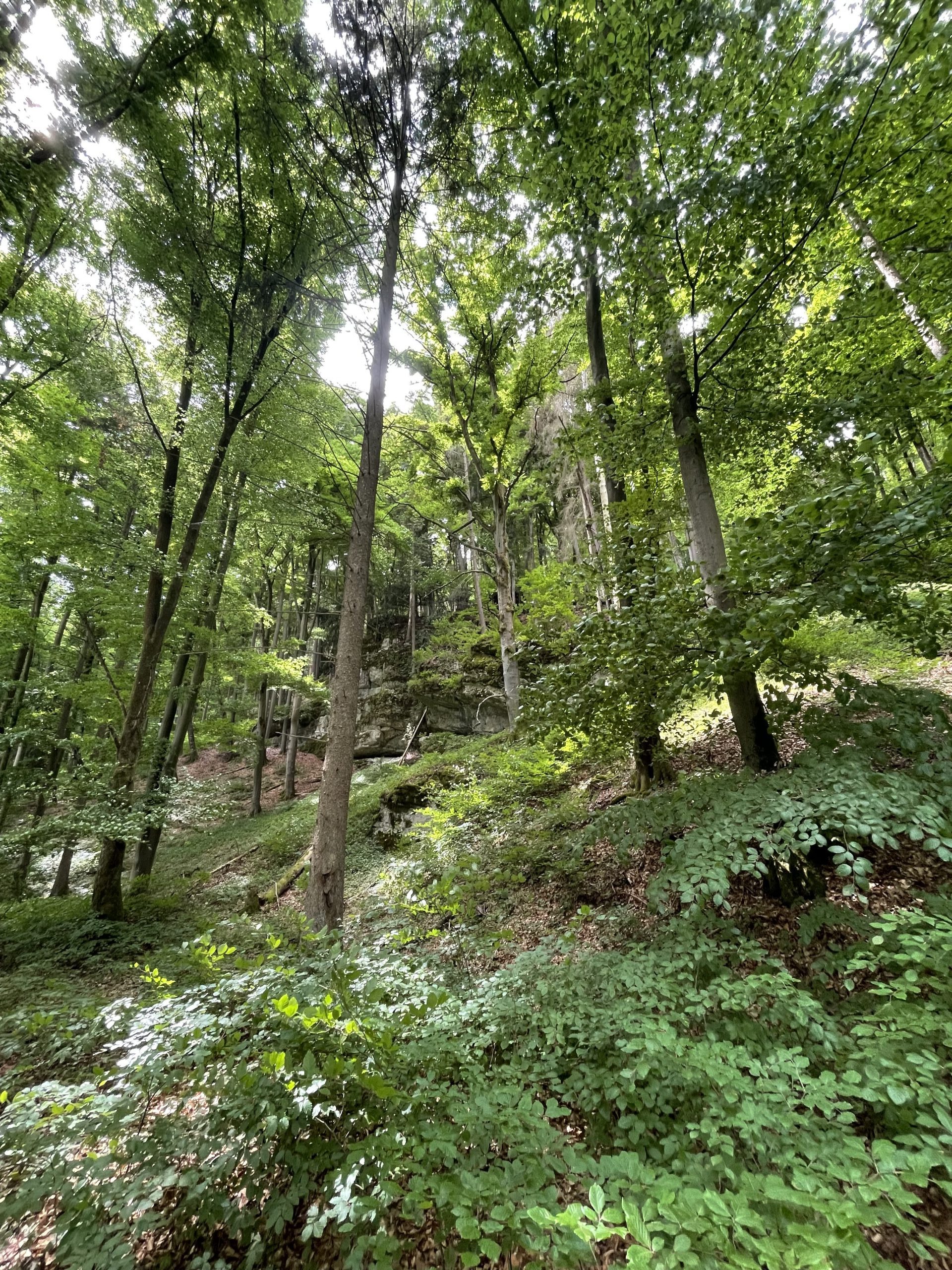 Nach der Mittagsstärkung ging es weiter hinauf, bis zum höchsten Punkt dieser Wanderung. Oben angekommen, wurden wir mit einem wunderbaren Fernblick über die Main-Donau-Schleife belohnt. Knapp 200 Höhenmeter unter uns schlang sich der Main-Donaukanal (auch Altmühl) um den gegenüberliegenden Speckelsberg. Nach einer kurzen Erfrischungspause führte uns der Weg hinab in Richtung Riedenburg.